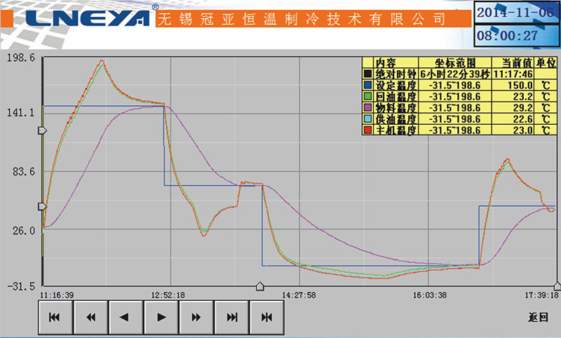 显示,物料无出现过冲现象。从高温150℃冷却到70℃整个过程耗时54分钟,可以看出夹套