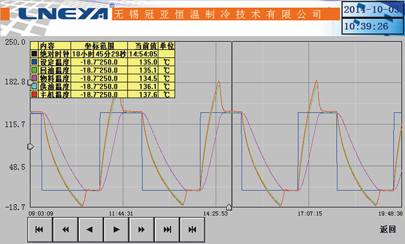 SUNDI-270应用于SENCO 50L双层玻璃反应釜,做了一个典型的10℃~135℃周期控制,该图