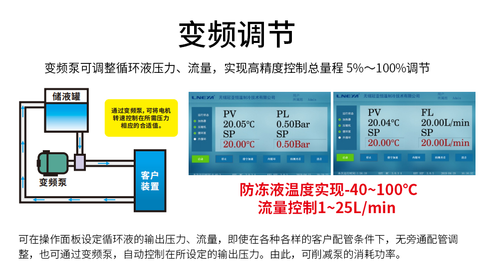 温度范围-20℃~+100℃制冷剂R404A/R507C/R125/N40 四种制冷剂均可使用控温精度±0.5℃加热功率15KW~38KW电源 380V 50HZ36KW~75KW重量900kg~1750kg