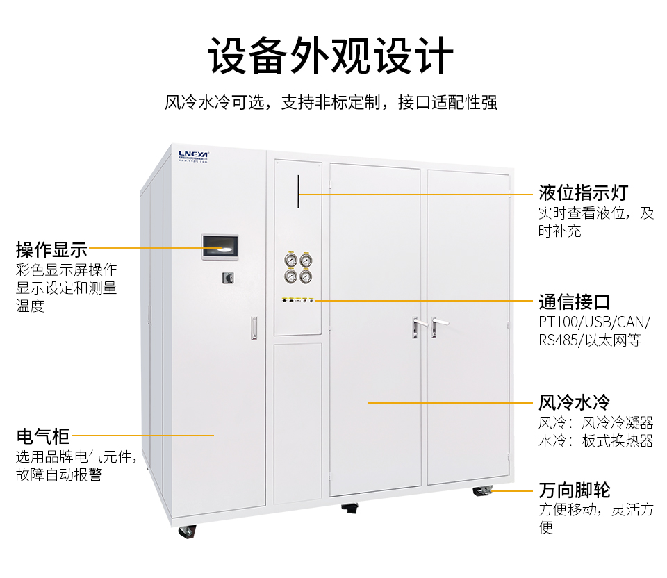 温度范围0℃~+100℃制冷剂R404A/R507C,出口采用R448A控温精度±0.5℃加热功率2.5KW~38KW电源 380V 50HZ4.5KW220V~61KW重量220kg~1300kg