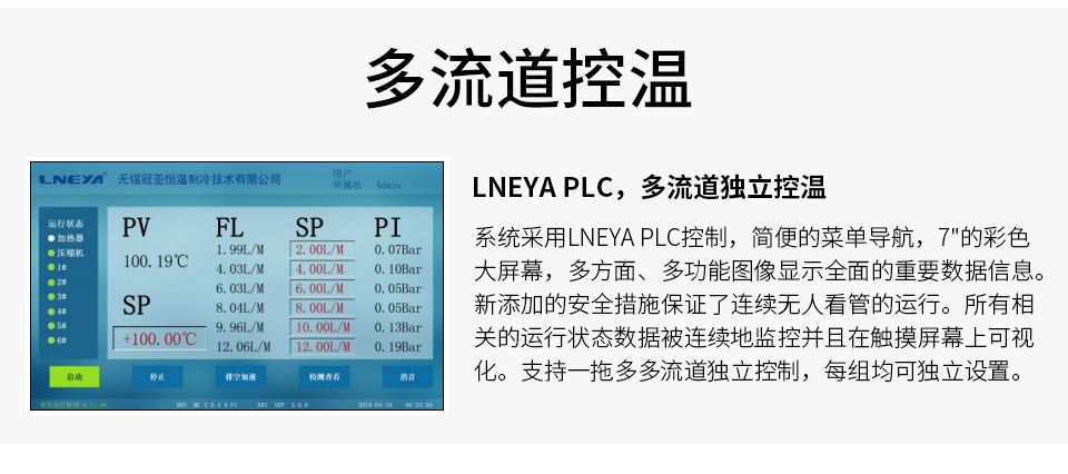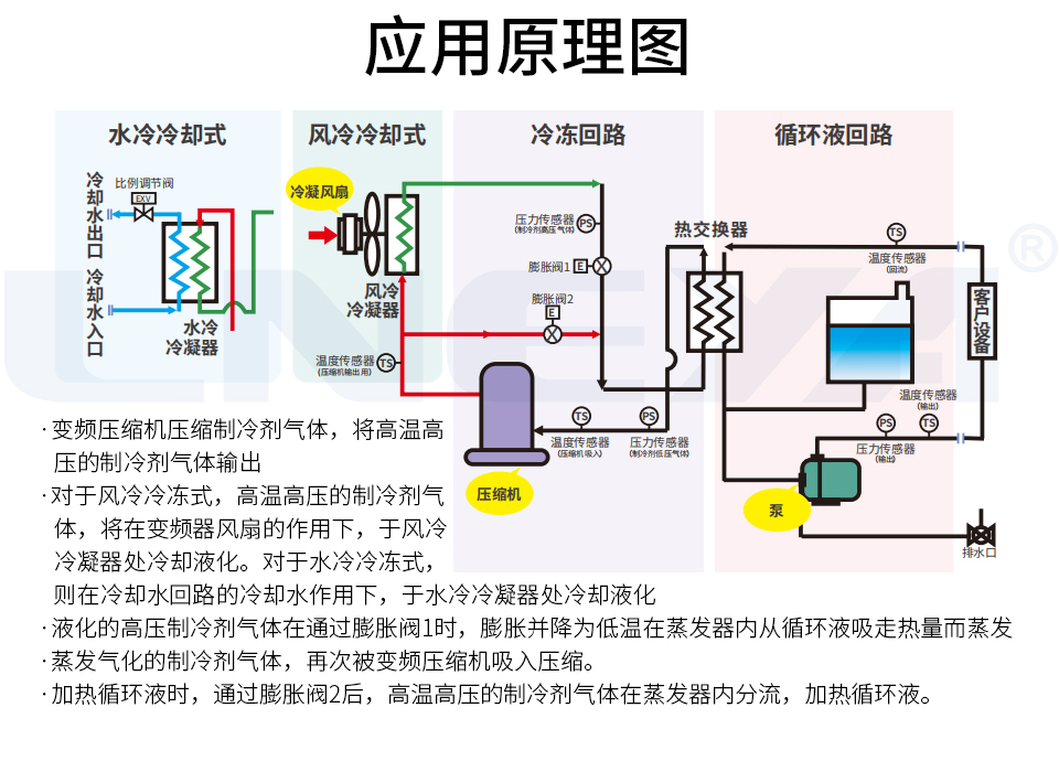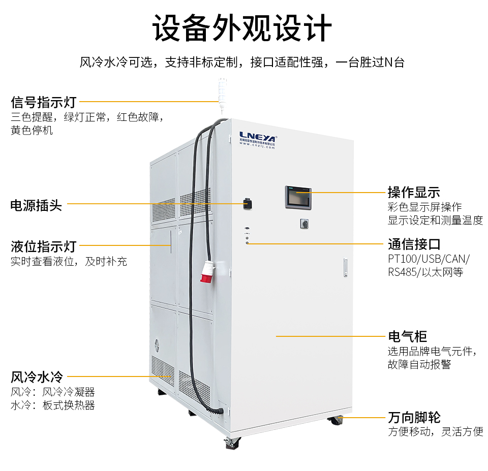 温度范围-20℃~+100℃制冷剂R404A/R507C/R125/N40 四种制冷剂均可使用控温精度±0.5℃加热功率15KW~38KW电源 380V 50HZ36KW~75KW重量900kg~1750kg
