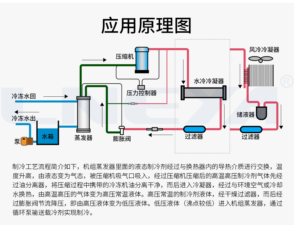 制冷剂R404A/R507C压缩机泰康/艾默生谷轮流量、压力max20L/min0.7BAR~50L/min1BAR电源MAX50HZAC220V1.5kW~AC380V8kW重量(风冷)145kg~380kg蒸发器板式换热器
