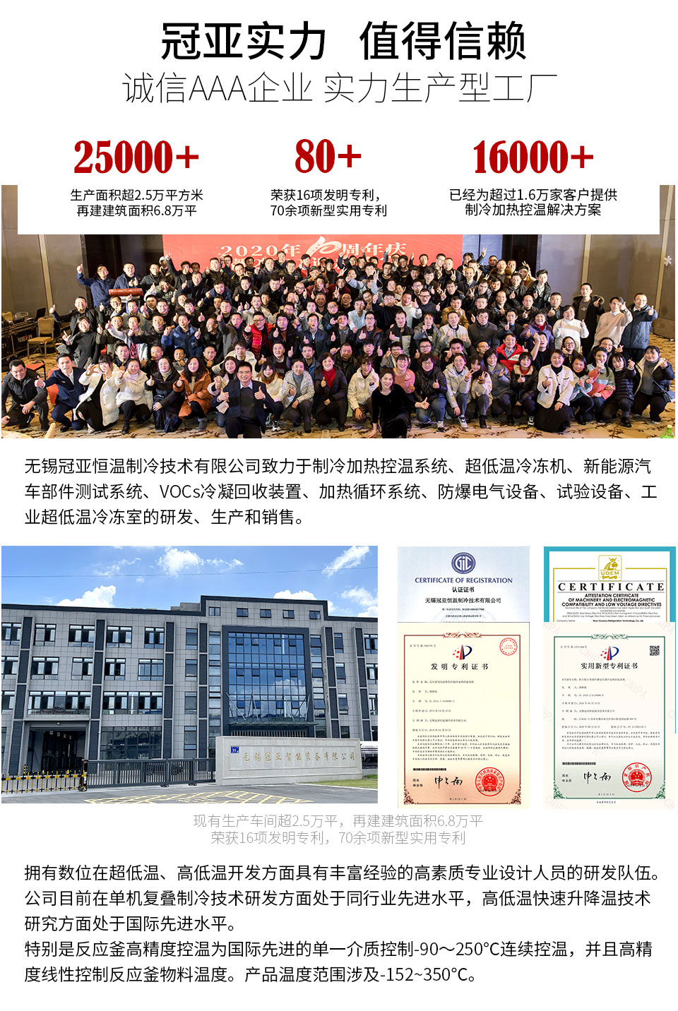制冷剂R-404A/R23/R14混合制冷剂导热介质温控精度±0.5℃循环泵冠亚磁力驱动泵电源AC380V 50HZ12kW~200kW重量435kg~3350kg反应物料温控精度±1℃