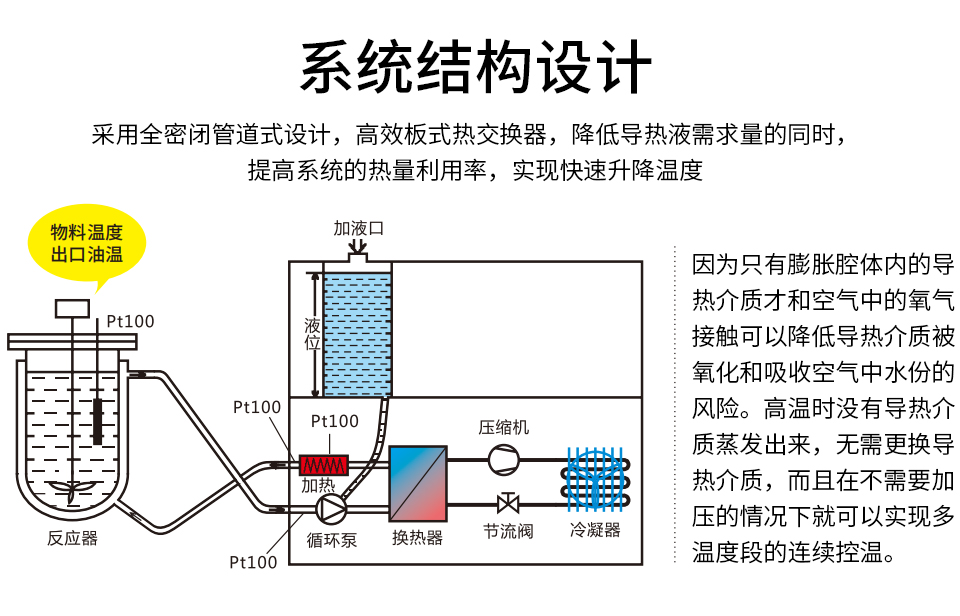 - 采用全密闭管道式设计,降低导热液需求量的同时,提高系统的热量利用率,达到快速升降温度。 膨胀容器中的导热介质不参与循环,可以降低导热介质在运行中吸收水分和挥发的风险;