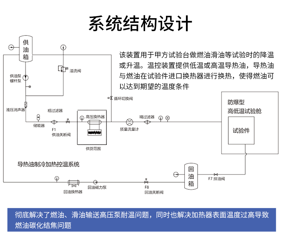 该装置用于为甲方试验台做燃油、滑油等试验时的燃油、滑油降温或升温。导热油制冷加热装置提供低温或高温导热油,导热油与燃油在试验件进口换热器进行换热,使得燃油可以达到期望的温度条件,原理示意如图1所示。