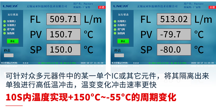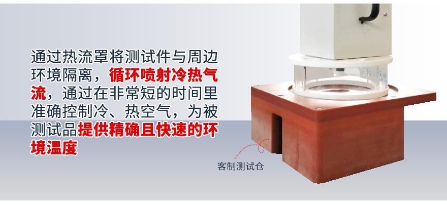 1、试验机输出气流罩将被测试品罩住,形成一个较密闭空间的测试腔,试验机输出的高温或低温气流,使被测试品表面温度发生剧烈变化,从而完成相应的高低温冲击试验;